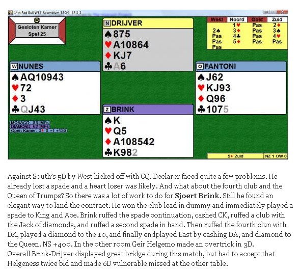 at NewsInBridge skriver om de samme spillene som kommer her. Denne ganger Sjoert Brink under overskriften "Endplay of the day". I tillegg nevnes begge ruterslemmene som Helgemo-Helness meldte. De finner du to artikler nede. :-)