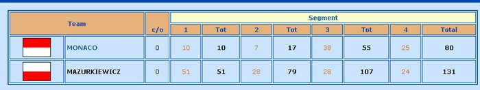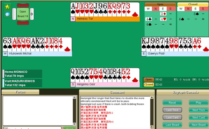 Denne gangen ble det polske laget litt for sterkt for Monaco - Zimmermann. Jeg finner ikke detaljer fra kampen og det tror jeg delvis skyldes Internetproblemer i Kina og at finalen ikke vises på BBO, men på Kina sitt eget "OurBridge". Jeg vet at sponsoren ofte spiller de første to sesjonene, og ser du på resultatene kan nok det stemme denne gangen også.