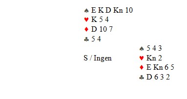 I lag er dette ikke så vanskelig, fordi det ser ut som vi må ha fire minorstikk for å beite. Jeg tar derfor for esset og makker følger på med nieren og spillefører med syveren. Nå vet jeg at fargen er fordelt med K93 hos makker (med K983 hadde han fulgt med åtteren andre gang, norsk fra gjenværende) og 872 hos syd. Vi har spilt nøyaktig for en beit når spillefører har 98, ED109876,872,7.