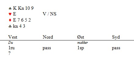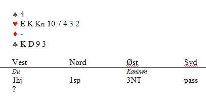 De fleste mener at Geir sin 3sp er for hardt. Jeg liker heller ikke å oppvurdere slike hender når en enda ikke vet noe om makkers kort. Vest sin ruter er flott hvis makker har rutertilpass, utem ruter hos makker er det en helt normal 12-14. Singel hjerteress kan være bra og det kan være ubrukelig til noe mer enn å ta et stikk. Knektene kan tette farger eller de kan være to unyttige glansbilder.