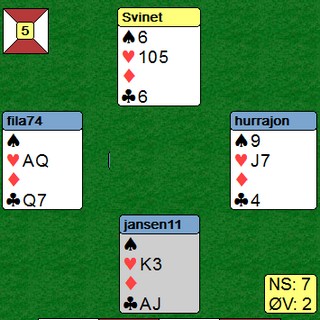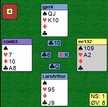 Jeg husker ikke verken hvem jeg spilte med eller mot i dette spillet, men poenget er like fint for det. Det kom EK i kløver og mer kløver. Jeg var i ferd med å kaste ruterdame fordi det måtte jo være en klink taper? Vent litt, det haster jo ikke å kaste ruterdamen. Jeg lar en spar gå først. Sitter den 3-2, kan jeg jo kaste ruterdamen etterpå.