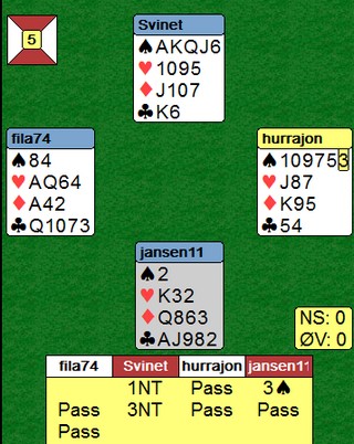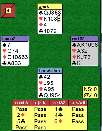 Hjerter til kongen går bra, men kløverkappen går ikke bra. Svinet spilte enkelt og greit kløver til esset i tilfelle vest hadde blanka dama sin. Det hadde han ikke, men fikk komme inn på den i tolvte stikk. Hjerterkongen ga det trettende og kontrakten. |