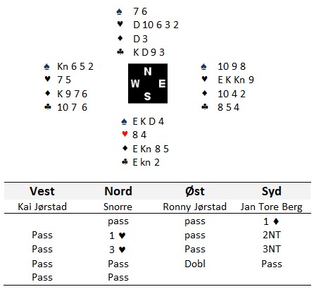 Som makker i nord tenkte jeg at nå har det klikka for Larvik-gutten, men av erfaring vet jeg at bak det som ser ut som en svært underlig plan, ligger det ofte som regel en genistrek. Ronny kom inn og kunne ikke ta mer enn tre hjerterstikk til sammen uten å godspille det niende i hjerter for spillefører. Han fortsatte i spar, men nå kunne Jan Tore farefritt ta ruterfinessen fordi forbindelsen til det fjerde hjerterstikket var brutt.