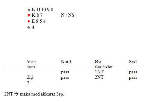 Med den siste hånda vil makker hoppe til 3hj, et hopp som ikke nødvendigvis betyr ekstra honnørstyrke. Hoppet til 3sp forventet jeg mer enn 13hp og en litt tam 5-4-3-1 hånd, men jeg skjønner selvsagt Geir sin tankegang.