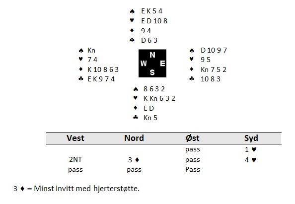 Jeg liker normalt ikke å spiintre singel ess, men det er jo singel hjerter (og delvis 5-4-3-1) som gjør at hånda kan være bra. Derfor er jeg ikke uenig med Nils som sier at "Skal du melde noe annet enn 2sp, er 3hj nærliggende."