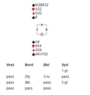 Ruter 4 og Erik Berg i Nord må ned på E10 dobbel i hjerter for å holde kløver 10x. Bordet kvitter seg med kløver 9. Hjerter til damen og en liten hjerter fra hver hånd. 11 stikk.