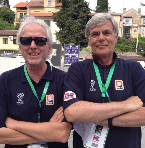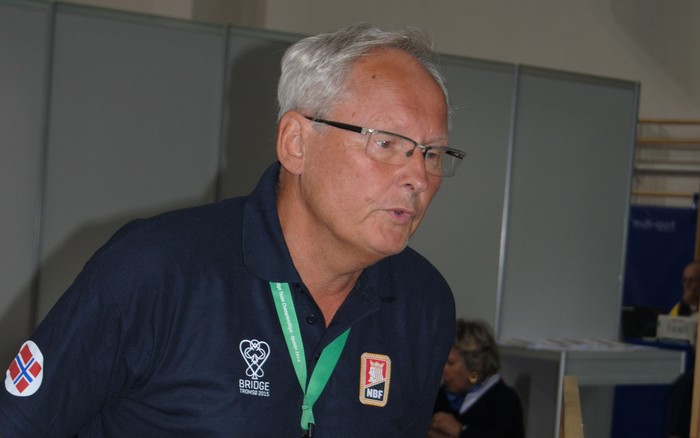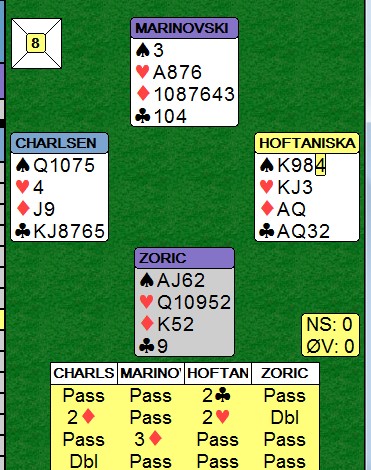 Jeg kan ikke systemet til Thor Erik og Thomas så godt, men er ganske sikker på at 2hj enten viser hjerter eller 18-19 NT. Syd doblet og mente det helt sikkert som hjerter, mens nord oppfattet det som opplysende uten hjerter, hvis ikke hadde han selvsagt støttet hjerter. Nord hadde seks ruter og meldte den. Under over alle under hadde også makker ruter, så da buklandet de heldig i 3ru. Så vet jeg ingenting hva Thomas sine meldinger betyr. 2ru har sikkert mange betydninger, men passen på 2hj doblet og doblingen av 3ru vet jeg ikke hva han mente som. Jeg tipper at sekvensen ikke er avtalt. Kroatene har opplagt hatt en misforståelse, men det er ikke forbudt å ha flaks. Dette er heller ikke en avtalt posisjon for NS, så da meldte nord ut fra det han mente var logisk. Det er strenge straffer for feil forklaring av systemet ditt, men når ting er uklart tror jeg det er vanskelig å komme noen vei. ØV var også opplagt ute på ukjent hav og fant ikke ut av sin svarte tilpass. Jeg er stygt redd -570 blir stående for Norge, men det kan hende scoren splittes. Vi får se hva som skjer. |