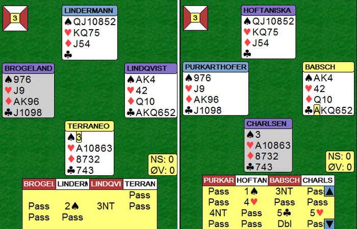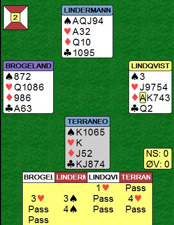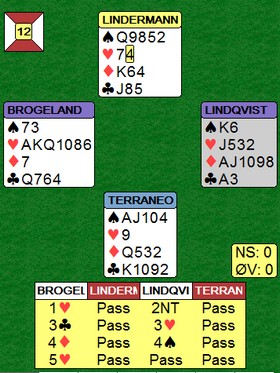 Øst meldte 4hj fordi han trodde makker hadde kløver og hjerter. I lista fra kampen står det 4hj med fire stikk, så det kan tyde på at vest ikke fikk lov til å ta ut i 5kl. Det kommer sikkert mer om dette spillet. |