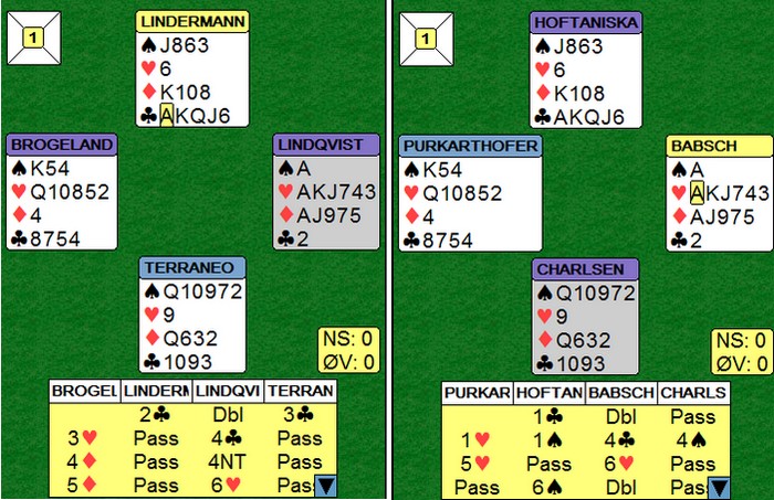 Begge lagene melder seg fint opp i 6hj, men Hoffa stamper i 6sp (!). Jeg skjønner ikke at han tør fordi det kan se ut som om motparten langt fra har kontroll på det de holder på med. Det kan heller ikke være så mye å vinne i like soner. Flytt en kløver i vest over til ruter, så er det ikke mer enn elleve stikk. 6sp går 800 og 5 IMP til Norge. Hvorfor vest ikke cubidda 5ru sånn at øst kunne få meldt slemmen mer kontrollert, er en annen sak.