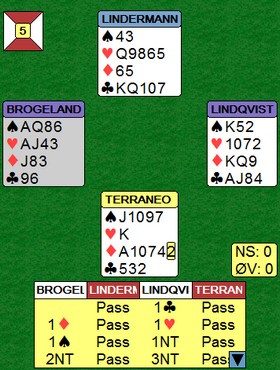 Nei, dessverre er det ikke alltid lengden det kommer an på. Fredrik Nystrøm hadde et spørsmål til makker. "Hvis du sparkontroll og et ess, da kan vi spille 6kl?" . Han fikk for så vidt svar på det han lurte på, men da var de allerede i 5ru! Noen ganger er det best å spill 1430 svar på Blackwood, mens andre ganger er det 0314 som funker. Nå prøvde de å buklande i 5NT, men Bessis var frampå med rødlappen når han skjønte at makker hadde majoressene. Hans hjerterkonge var beita i 5NT, denne gangen mange beit om NS hadde stoppet der.