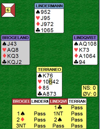 Tor Helness i øst var tilsynelatende superflink ta han la liten på ruter 9. Bessis gikk opp på kongen og smilte en stund da har trodde han hadde lurt Tor. Teller du tapere på hånda, så har du tre i kløver og tre i ruter, men bare tre trumfer igjen. Da ble det ei beit likevel.
