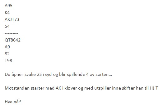 Nå vil jeg tro mange spiller hjerter til esset og stjeler kløveren med nieren i bordet. Så trumf. Ser ikke dette enkelt ut nå da?