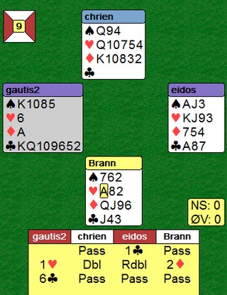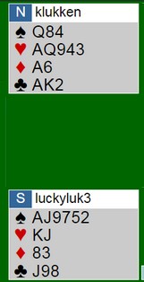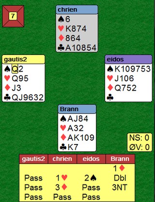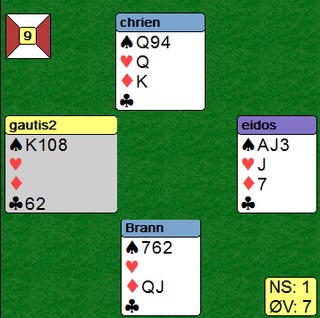 Mathias Beyer i syd spilte ut hjerteress og skifta til ruter. Så fem ganger kløver inkludert hjerter konge og hjerter til stjeling. Nå er stillingen som under: |