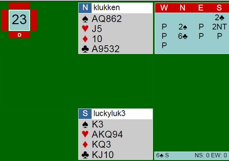 Den nest siste trumfen og begge motanderne kastet ruter. Fra bordet forsvant sparknekten. På den siste trumfen kasta nord spar og hjerter knekt hadde gjort sin nytte. Syd måtte også kaste spar for å holde ruteren. Nå var det veldig mye som tydet på at nord hadde hjerterdamen igjen og syd ruterdamen. Derfor sparen fra topp og +1370. Småfint!! |