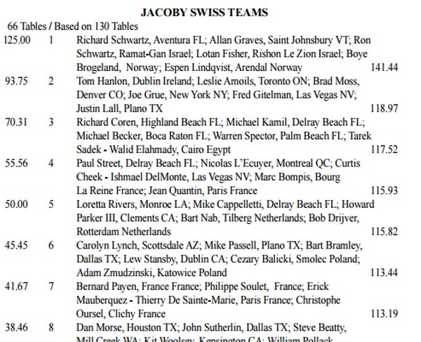 Mange av lagene som blir utslått i Vanderbilt går inn i Jacobys Swiss. Det betyr at nivået er svært høyt mot slutten og når Espen og Boye vinner med den marginen du ser under, er det kun ordet "imponerende" som dekker. Gratulerer!!