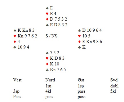 Singel ruter hos makker var kanskje ikke det beste Karl Olav kunne ønske seg, men til tross for at makker gikk ned i 4hj over 3sp, meldte han en gang til. Da hoppa Calle ut. Når ruterkongen satt tredje i kapp, var det ikke mulig å gå beit. Karl Olav stjal to ruter og kongen kom deisende på. Hjerterkongen til motparten, men +1430.