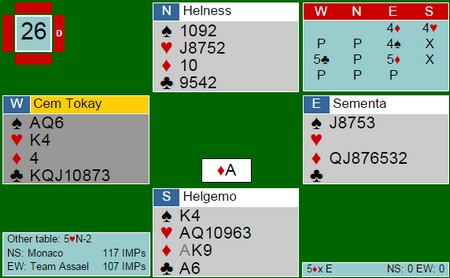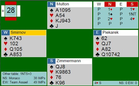 Sementa - Tokay passer ut invitten, mens Fantoni - Nunes kommer i 6NT etter en nesten identisk sekvens fram til 4NT. Selv med kløveren 3-3 og hjerterkongen foran damen var det bare 11 stikk. Eneste vinnersjanse i praksis hadde vært 3-4-3-3 / 3-5-2-3 / 3-6-1-3 i syd med hjerterkongen og DKn10 i spar. Da ville han blitt innspilt i spar og måtte gitt bord to i hjerter. (3+2+-3+4 = 12).