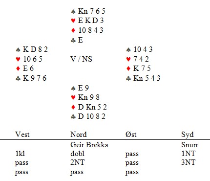 Det er ikke så ofte jeg får til fine spill, så derfor tar jeg meg den frihet å komme med litt selvskryt: Legg merke til Geir sin tøffe 2NT.1NT er en halvpositiv melding og det er lettere å spille mot en mann. (vest) Vest spilte ut hjerter som jeg stakk i bordet og spilte en til knekten min. Det er viktig å spille første ruter mot bordet, sånn at øst kommer inn i fargen første gang. Ruter til dama vil vest stikke og spille kløver til singel ess. Nå er det ikke greit at øst kommer inn i ruter. Derfor ruter til tier og konge. Kløver til bordets ess og mer ruter til dame og konge. Vest fridde seg med hjerter. |