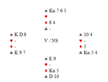 Øst passer (!) 4NT og går tre beiter med ruter ut. Det er "bare" å dukke ruteren to ganger og så ta hjerterkappen, men en like god spilleføringi 4NT er kanskje EK i hjerter og så sparkappen. Dette fordi at en kan ikke se at ruteren sitter 5-3. Slik spilte tyskeren og gikk to beit.