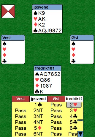Jan Petter Svendsen satt nord og åpnet med 1kl som kan være ganske så kort. Makker i syd er Fredrik Helness. 2hj = 6+ spar. 2NT = "Jeg er sterk og har hold andre steder" 3hj = Ny overføring 3NT = "Jeg vil spille minst utgang uansett" 4kl = Cuebid 4NT = Blackwood 5kl = Ett ess 5ru = "Har du spar dame" 6kl= "Ja, pluss kløver konge" 6NT = Da spiller vi her" I 6NT gjør det ingenting om sparen sitter både 4-1 og 5-0. |