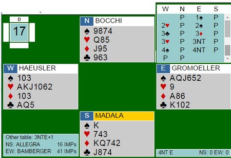Begge to fikk ruter ut og italienske Duboin tok dobbelfinessen i hjerter for sitt niende stikk. Tyskeren Heusler prøvde seg på en artistisk variant og gikk beit.