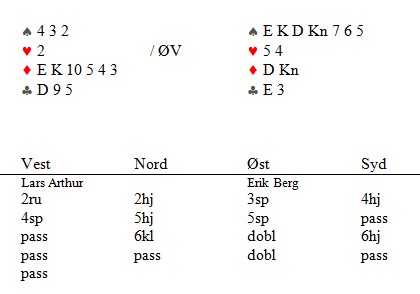 "Kunne vi klart å meldt denne slemmen?", spurte Lars Arthur. Jeg vet ikke, men skulle det være sjanse så må Erik tolke passen på 6hj som singelton og EK i ruter?
