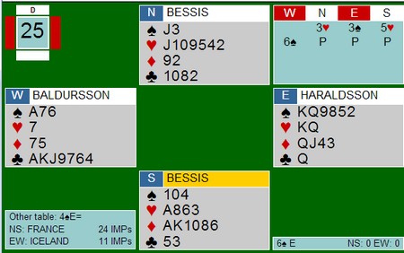 Det var langt fra alle parene som meldte denne slemmen og der Helge og Roald Mæsel spilte, var det over 25 IMP i sving på å gjøre rett. Israel stoppet i 3NT i åpent rom.