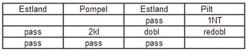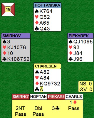 Denne er enda verre. Normalt er å spille slik at når Thor Erik styrkedobler innmeldingen 2NT (kløver og hjerter), settes det opp kravpass og motparten kan ikke spille udoblet lenger. Det er fint mulig å spille annerledes, men da må det være en makkerskapsavtale. Thomas i syd avventet med sin pass og håpet makker kunne straffedoble. Han så i alle fall ikke for seg at det kunne gå pass rundt. I EM kan vi ikke la motparten spille 3kl nå vi har 28 hp. Sånn er det bare! |