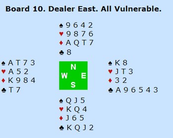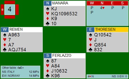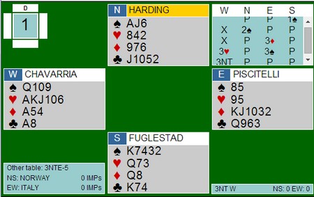 Et annet poeng er at i de siste internasjonale mesterskapene har Italia spilt alle sine kamper på BBO. Jeg vet ikke sikkert hvorfor, men antar at det er rike bakmenn som har en finger med i spillet. Om dette har vært en fordel for Italia er vel mer sannsynlig enn ikke. Rutinerte spillere gjør ingenting av å spille for hele verden, mens andre kan ha en tendens til å gjøre dummere og rarere ting på BBO enn de kanskje ville gjort ellers.