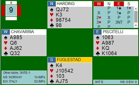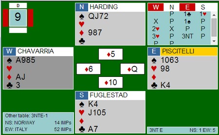 Så en veldig fin prestasjon av Italia i 3NT. Ann Karin spiller ut hjerter to til konge og ess. Kløver til damen, kløver til ti og knekt fulgt av mer hjerter til damen. Nå ser det da dødt ut? Neida. Ruter til kongen, dame og posisjonen er under til venstre. Spar til åtter og Marianne sin knekt. Hun har ikke kort å spille inn makker på, så hun må fortsette med ruter. Spar ess feller kongen og mer spar godspiller nieren. Marianne er inne nok en gang og må gi bordet de to siste. 2 + 2 + 4 + 1 = 9 |