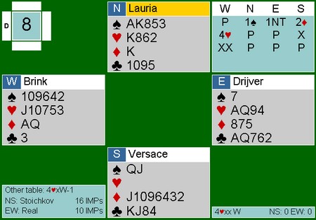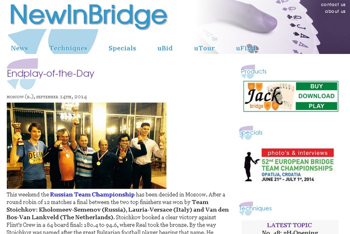 Det er litt moro at det spillet jeg refererte fra allerede på lørdag, kommer som hovedoppslag på "NewInBridge" sin nettside. Der gratuleres de multinasjonale vinnerne av det russiske mesterskapet. To x Putin, To x Italia og to x Nederland,samtidig som de trekker fram det fine innspillet.
