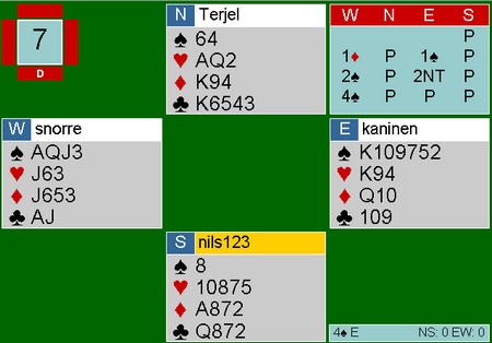 Spar ti måtte nord dekke, men da stjal spillefører i bordet og tok for hjerteresset. Så kløver til stjeling med den siste trumfen og du ser sikkert hva som skjer nå. |