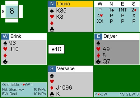 Dette er faktisk fra det russiske mesterskapet, selv om det er ingen russere som spiller på dette bordet. Syd sin dobling var nok basert mest på mistanke, men nord var godt fornøyd og spilte ut sparesset og skifta til ruter konge (!). Han var redd kløveren og prøvde å sette opp stikk. Ruter ess, kløver til esset, kløver til stjeling, hjerter til damen, ruter til damen og stjeling. Nord fortsatte med en liten spar til stjelilng i bordet. Så kløver til stjeling igjen og spar ti i posisjonen under |