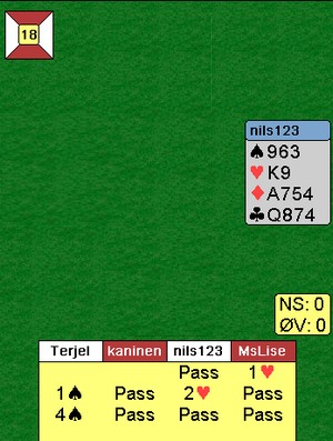 Jeg rista på hodet over hans invitt når jeg medte 2sp. I min verden hadde jeg 14hp og nesten NT-åpning. Da måtte jeg da ta imot invitten til 4sp? Han hadde bare åtte honnørpoeng og jeg sendte han rett i skammekroken for nok en overmelding.