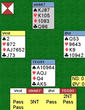 Så kommer det jeg kaller et tøysespill. Selvsagt kan det være rett å spille 3NT, men nord bør absolutt sjekke om makker har fem spar først. For nord kan både kløveren og ruteren være åpen. Joda, kanskje uflaks at de manglet ruterhold og at vest hadde ruterutspill, men fortjent staffet spør du meg.