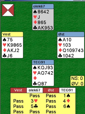 Jeg repeterer hva problemstillingen er før jeg slipper han til. Jeg hadde den tamme hånda i syd (øverst) og åpnet alle i sonen med 1kl (2+):
