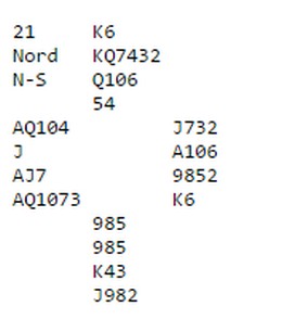 Syd spiller 3NT etter at syd har vist 20-21, og vest starter med hjerter 3, norske utspill, til makker ess.