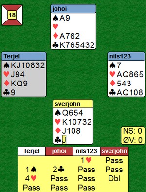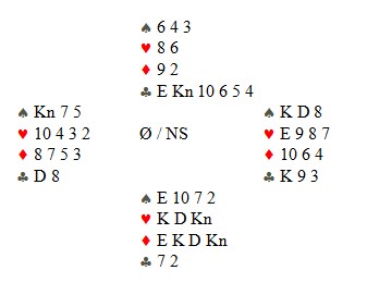 Spillefører legger knekten under esset og stikker neste med kongen. Vest følger på med toeren. Så kløver til bordets tier og øst er inne på kongen. Han spiller mer hjerter, men siden makker har bare fire stykker er toget godt. Hva gikk galt her? Logg deg på og svar med, er du grei. |