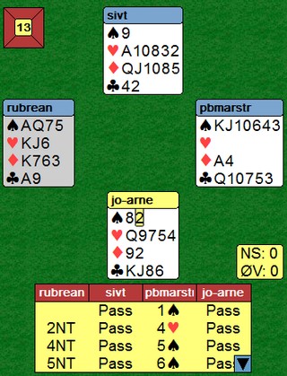 KJ i hjerter var ikke det beste Rune kunne ha, men ta nå vekk dem og han vet at ruterkongen og kløveresset er med å tetter makkers farger. 5sp viser to ess og trumfdamen og når Rune i vest ser ned på den selv, vet han at makker har minst seks spar. 5NT er storeslemsinvitt og viser alle nøkkelkort. Hadde Peter hatt kløverkongen i stedet for damen, ville han vist den. Rune hadde fulgt opp med en ny invitt med 6ru og storeslemmen hadde blitt meldt.