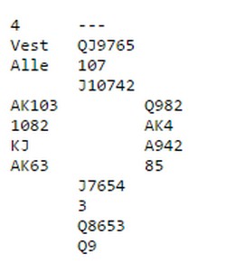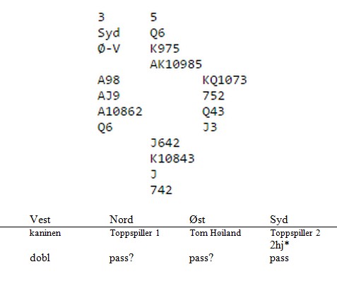 Vest spilte ut kløverdame til esset. Så spar fra bordet og nå kommer det som ble problemet i spillet. I øst legger du i en sparhønnør, men hvilken? Tom Høiland stakk med damen og spilte trumf til esset og mer trumf. Så en ruter fra bordet til damen i øst og mer spar. Nå skulle vest stukket med esset (ikke nieren) for å få en sparstjeling, men han trodde makker hadde DJ10 når han stakk med damen første gang. Da var det katastrofe å bruke esset.