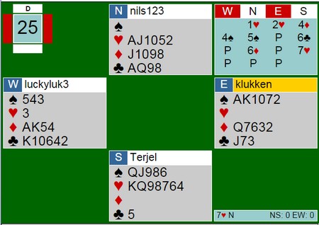 Noen sa at syd kan beite ved ikke å stjele over den første kløveren, men det er jeg rimelig sikker på ikke stemmer. E9 i ruter vil komme til å ta de siste to stikkene. (tror jeg i alle fall)