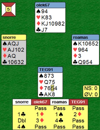 Det kom ruter ut som han stakk med esset. Så kommer spillets hovedpoeng. To ganger trumf og så kløver til nieren. Mer ruter stjeler du og spiller hjerter til tieren. Ingen makt i verden kan beite lenger. En gang trumf går ikke fordi da tar motparten en stjeling. Tre ganger trumf går heller ikke, fordi du rekker ikke på godspille både kløveren og få tak i to hjerterstikk. Hvem har sagt at veteranene står tilbake for noen av oss? (Joda, tre ganger kløver til stjeling beiter.) |