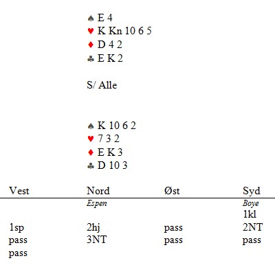 Når en spiller parturnering og er i 3NT på 5-3 i major, må en alltid vurdere hva de andre i salen gjør. I BAM-lag er det nok å tenke på hva motstanderen på det andre bordet gjør og i dette spillet ser det normalt ut å være i 3NT. Da handler det om å få mest mulig stikk. Å satse på at en finesse går, er noe vi alle gjør i nesten hvert eneste spill. Å spille på at finessen IKKE går, er i prinsippet akkurat det samme. Boye fikk spardamen ut som han stakk i bordet og spilte seg hjem i minor. Så hjerter til kongen (!) og når Ex var til venstre og Dxx til høyre kom vest inn første gang i hjerter. Da var sparen beskytta og det endte med elleve stikk. Den som tok hjerterfinessen fikk et mindre fordi ØV rakk å sette opp et sparstikk før hjerteren var etablert. |