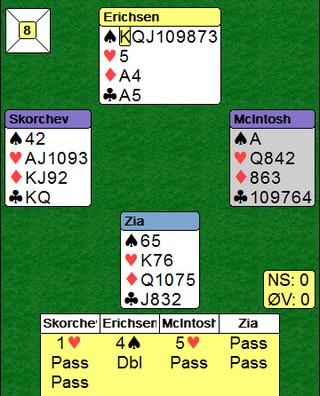 Noen finner alltid utspillet!! Jeg skjønner veldig godt at Zia legger en liten kløver i stikk en, selv om 4kl er en sterk hånd med hjerter og kløver. |