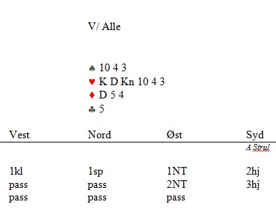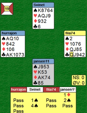 Karl Christian Baumann starta med kløverdame og mer kløver til stjeling. Hjerter til bordet og spar. Hvis Svinet vinner første stikket med sparkonge, er det mulig å spille på at fargen sitter 3-1. Da tar han EK i ruter og all hjerteren. Hvis ikke vest stjeler, blir han innspilt i trumf og må så spille kløver til dobbeltrenons. Rutertaperen forsvinner. Jon Solli Hansen i vest la spar dame (!) første gang. Det koster aldri stikk og nå skjønner jeg godt at spillefører trodde sparen satt 2-2. Spiller han som over og trumfen sitter, ler vi alle av han, Fint, Hurra!! |