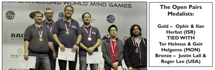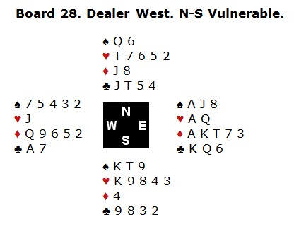 | Spillet til høyre er fra det pågående Sport Mind Games i Kina. Geir og Tor er med som et av fire lag, men de klarte ikke å komme seg til finalen. Der møtes USA og Israel. I spillet til høyre slapp Tor og Geir hjem 6ru og uten at jeg har sett spillet er det nok nord som har gjort en feil. Jeg tipper spar ble spilt fra vest og da må nord på med damen (!). Hvis ikke så skjer, elimineres hjerter og kløver før nord får komme inn på spardamen. Spartaperen forsvinner da når nord må spille til dobbeltrenons. |