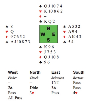 Ron Schwartz hadde vel ingen grunn til å starte med sparesset og mer spar, så ruteresset kom ut til stjeling på hånda. Hvis spillefører prøver å gå inn i bordet for å ta en hjerterkutt, vil motparten nesten alltid kunne sette opp en sparstjeling. I alle fall hvis han spiller spar, så alternativet må i tilfelle være kløverkongen. Curtis Cheek hadde ingen tro på at det kunne gå bra, så han la ned hjerterkongen fra hånda i stikk tre (!). Nå kunne ingen makt i verden beite han lenger!!