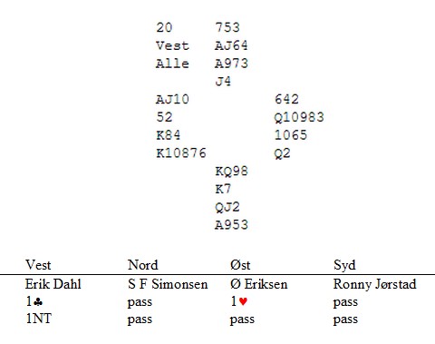 Ruter ut til knekt og konge.Kløver til damen som stod (!) og ny kløver til 10 og min knekt. Smithsignalene var i orden, så vi cashet ruteren før jeg spilte spar fra nord til dame og ess. Mer spar fra spillefører til Jørstad sin konge. Han fortsatte med en liten hjerter til mitt ess og jeg spilte enda en hjerter til Ronny sin konge før han puttet Dahl inn i spar . Vi fikk de to siste når spillefører måtte avslutte med kløver fra K8 til E9. Tre beit. Småpent dette vel?