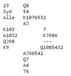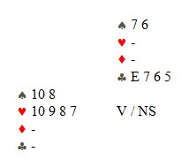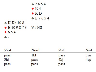Nei, selvsagt gjør du ikke det i posisjonen til venstre. Hvis du gjør det, kan du ta for spar 10, men så må du spille hjerter til dobbelrenons og kløvertaperen forsvinner. Du kaster bare hjerter på den første ruteren og enda en på den neste. Kløver mot esset stjeler du heller ikke, men så tar du og makker resten når han har kløverkongen. Lett! |
