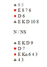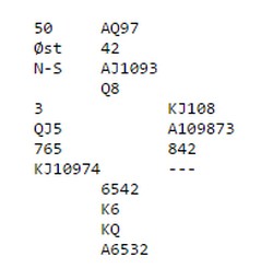 Du har meldt deg opp i 6NT og får hjerter ut. Du har ikke noen valg, men må legge liten i bordet. Damen vinner heldigvis stikket. Hvilken plan har du? Jo, du må ha ruterstikk. Det er ingen vits i å ta kappen, fordi du vil uansett måtte gi bort et ruterstikk. Derfor er det best å starte med en liten mot damen, så du spiller en tass til damen som vinner. En glimrende start! Når ser kløveren fristende ut og faller knekten har du tolv stikk. 3+2+2+5 = 12. Men sitter ikke kløveren, har du et problem. Tar du for EKD og den ikke sitter, må du gå tilbake til ruteren fordi det holder ikke med fire kløverstikk. (3+2+2+4 = 11). Hvis du nå gir bort et rutersttikk, kan den som kommer inn ha kløverknekten å ta for. Derfor skal du spille mer ruter etter å ha fått for damen. Best en liten fra hver hånd. Nå vinner du 6NT om enten ruteren sitter 3-3 eller kløveren gir fem stikk. |
